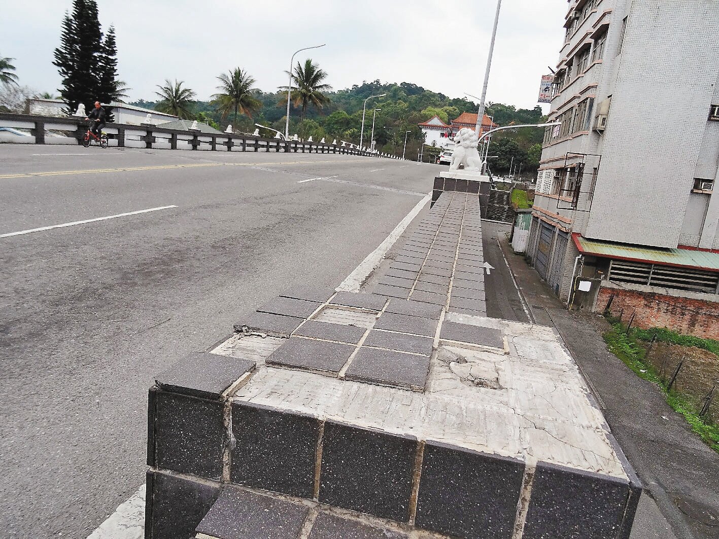 花蓮市尚志路橋右側(面向忠烈祠方向)的第20座石獅子「不見了」,只剩橋梁的基座,相當突兀 。(記者段鴻裕/攝影)