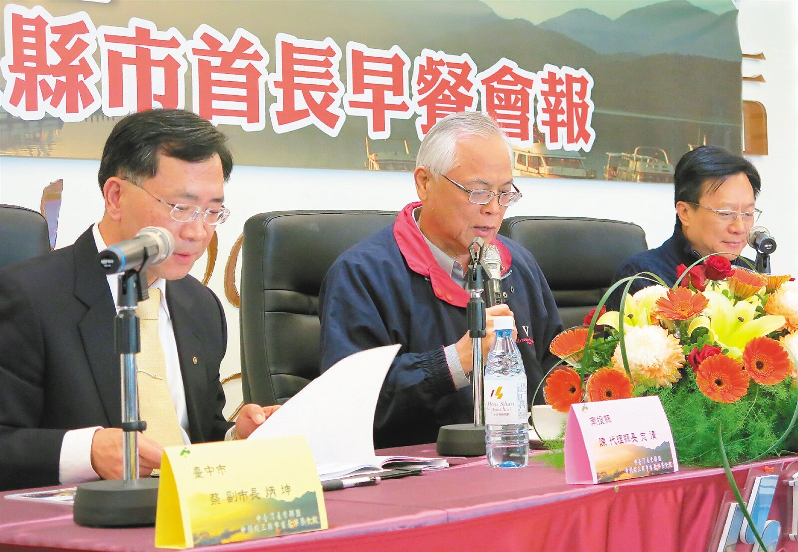 中彰投三縣市首長早餐會報由台中副市長蔡炳坤(左)、南投縣代理縣長陳志清(中)、彰化縣長卓伯源(右)共同主持會議。(記者賴香珊/攝影)