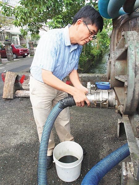 環保局長陳登欽昨將水肥車的排管打開,一陣惡臭傳出。(賴秉均攝)