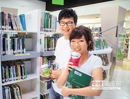 國考遇見愛,劉佑宗(見圖左起,吳江泉攝)、朱聖婷兩個為準備國考年輕人,4年前不約而同在高市鼓山圖書館自修K書,聖婷國考慘敗過,在佑宗不斷鼓勵不但雙雙金榜題名,感情也修成正果,29日兩人到圖書館拍婚紗照,並捐款購書冠名見證幸福。