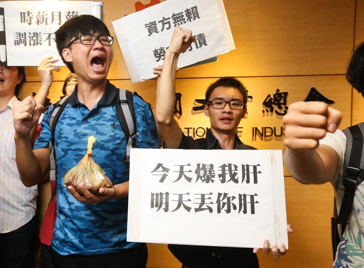 勞動部前天開會通過基本工資明年漲百分之五,勞工團體認為漲太少,昨天到工業總會踢館,並送上血淋淋的豬肝,抗議資方向行政院提出刪除七天國定日假等六大訴求,只會讓勞工爆肝。