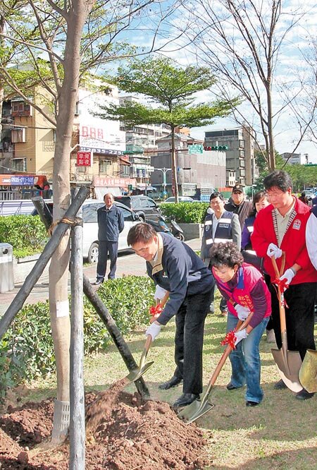 台北市推動4年35條林蔭大道計畫,預計將增加喬木近5000株,29日在艋舺大道旁公園舉行植樹活動,郝龍斌市長(前左)也前來參加,和貴賓一起植樹(趙雙傑攝)