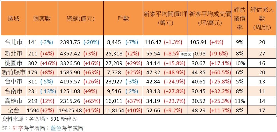 根據591新建案統計,繼去年全台推案量攻頂1.7兆,今年再次超越極限,總銷高達1.94兆元,與去年同期相比年狂漲近1成多,連個案數、戶數較去年同期雙雙大增1成多,量能維持超高水位;此外,全台新建案無論開價、成交價同樣再創新高,目前均價都已抵達5字頭,較去年同期大漲1成多。