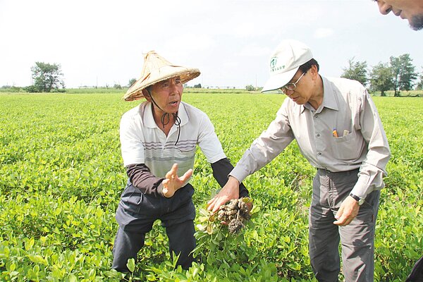 農委會副主委陳文德(右)昨天到雲林縣勘查農損,農民滿臉無奈。 (圖/姜宜菁攝)