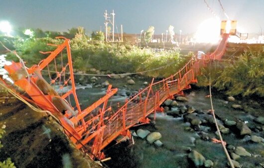 新北市三芝區根德水車園區內紅色吊橋昨天下午突然斷裂,橋上四人從二、三層樓高度墜落溪床,幸無生命危險。(記者林昭彰/攝影)