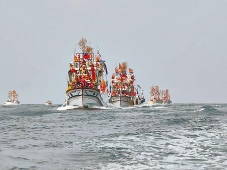 高雄林園鳳芸宮及靈帝殿28艘大型漁船及客輪搭載37頂神轎,1日上午抵達安平漁港碼頭。圖/中時資料照