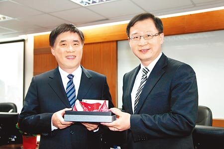 桃園縣將升格為直轄市,桃園縣長吳志揚昨率領50位縣府一級局處首長,到台北市政府取經,郝龍斌市長親自出席,並互贈禮物。(林佩怡攝)
