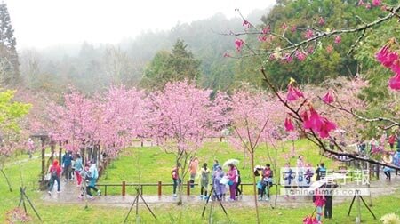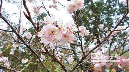園區有小櫻王之稱的工作站前唐實櫻則幾近滿開,還有佇立森林鐵道沿線的琉球緋寒櫻,枝條與吊鐘垂狀花朵就像天然迎小火車花圈,成為熱門攝影景點,寒春回暖後大島櫻、霧社櫻和吉野櫻也將連番登場,花期長達1個多月。