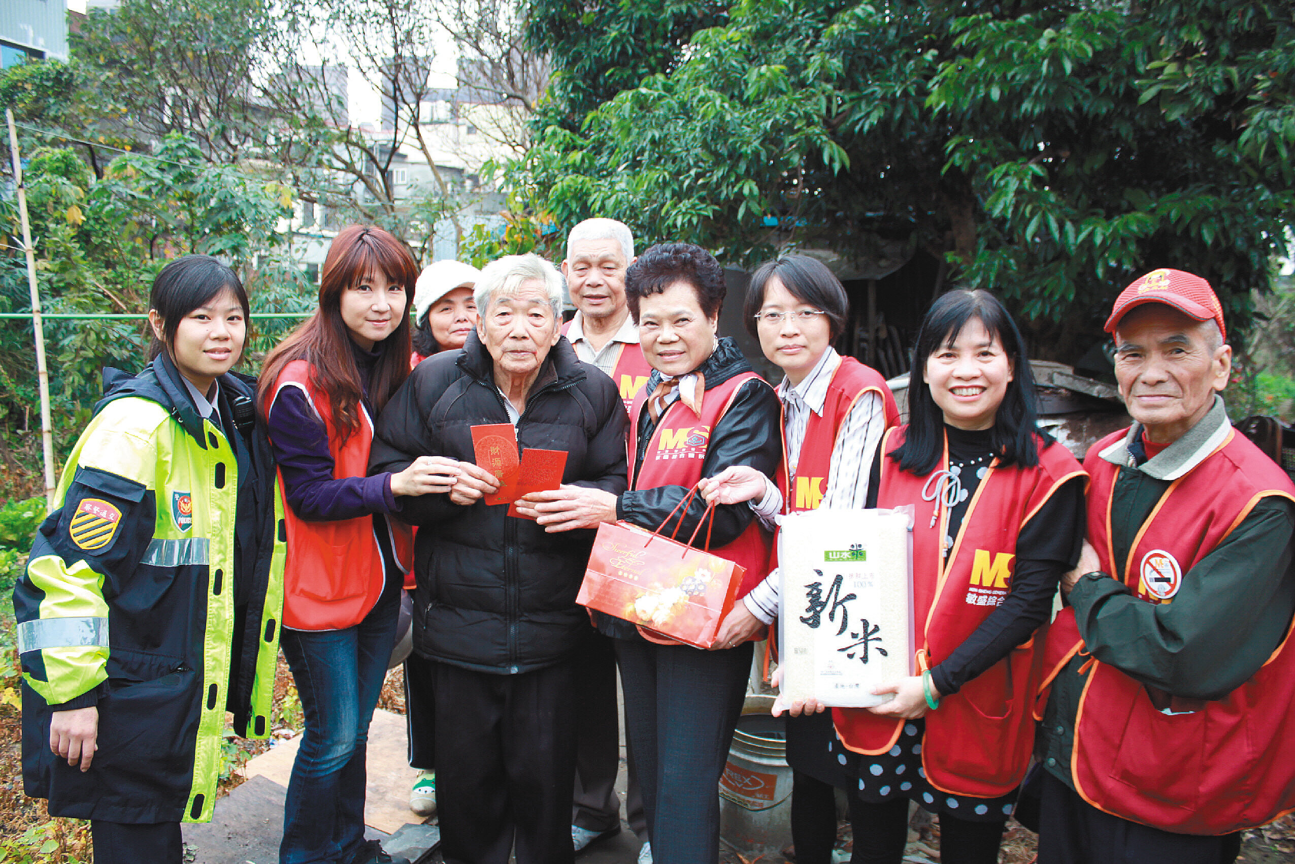 楊怡珊昨天捐助3000元慰問金,志工隊也準備臘腸等年節禮盒,81歲志工隊組長鄧月英還自掏腰包捐2000元。