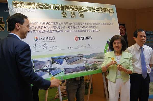 新北市政府推動綠能校園計畫,7月1日由市長朱立倫及大同公司總經理林郭文艷共同簽約,經濟部能源局長歐嘉瑞出席見證。朱市長指出,利用學校屋頂設置3百萬峰瓦(MWp)的太陽光電系統,除可活化校園閒置屋頂、降低屋頂3至5度的溫度,並可改善發電結構。依台電公司統計,101年家庭年平均用電量為3,516度,該計畫將可提供853戶家庭年用電量;另二氧化碳年減少1,608公噸,約為4座大安森林公園1年的碳吸附量;市庫每年還可增加150萬元的收入。