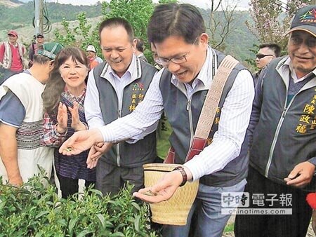 「台中阿龍在梨山採茶!」林佳龍徒步登上海拔2200公尺、位於黑森林附近的古邁茶園,泰雅族茶農陳婉萍指導「阿龍」手採「一心二葉」上等茶菁,林佳龍忍不住將現採嫩芽放入口中,盛讚「頓時齒頰彌香,梨山茶最是清香芬芳!」