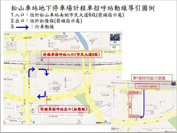 配合松山車站計程車排班區地下化,松山車站南側及北側出口前臨時計程車招呼站將一併取消,改規劃為民眾汽機車臨停接送區,並禁止計程車排班載客。計程車排班區地下化初期,該處將派員於車站內協助導引民眾,並於車站內張貼導引標示,以方便民眾轉乘計程車。