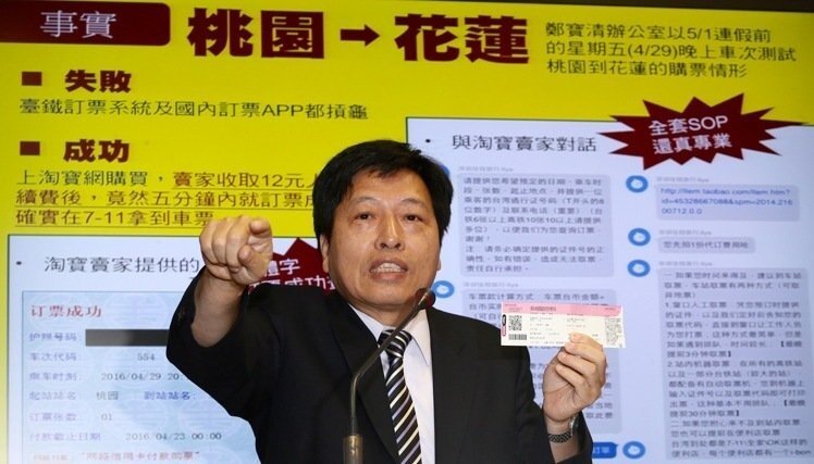 在台鐵官方網站訂不到的票,在淘寶網卻訂得到?立委鄭寶清今天在立法院交通委員會質詢時,秀出一張他在淘寶網訂到的桃園到花蓮的熱門時段火車車票,質疑為什麼淘寶網可以訂到台鐵官網訂不到的車票。