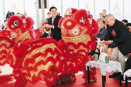 「台北南山廣場」27日舉行動土典禮,台北市長郝龍斌(左)與潤泰集團總裁尹衍樑(右)出席儀式,並接下舞獅送上的好采頭。(實習記者林彥君/攝影)