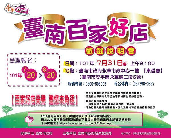 2012台南購物節「百家好店」票選活動1日起開跑!10月14日前上台南購物節活動專屬網站投票給心目中最能代表台南的「百家好店」,就有機會抽中1000元禮卷。