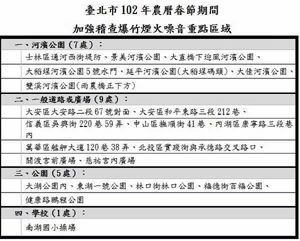 台北市環保局說明,該局衛生稽查大隊在接獲市民檢舉時將派員前往稽查,若發現有違反前述規定以致妨礙安寧情形,將依法進行告發。台北市環保局特別提醒民眾,在春節期間公告禁止施放時段,該局稽查人員將鎖定去(101)年春節期間民眾常陳情燃放爆竹煙火的22處熱點(詳附表2)進行巡查取締,另該局亦表示,為避免在住家附近燃放爆竹煙火造成噪音及安全問題,在未管制時段,建議民眾仍應選擇市府水利工程處開放6處河濱公園指定地點施放爆竹或煙火,以減少對鄰居的影響及兼顧居家安全,詳情可逕至市府水利工程處網站查詢。(網址:http://www.heo.taipei.gov.tw/ct.asp?xItem
