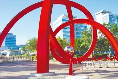 另一件作品《金色山脈》則是以玉山和大肚山輪廓線條為造型,在兩線交接處,崁入一顆雕花造型的不鏽鋼球,代表著中科之球,在陽光的照射下發亮。