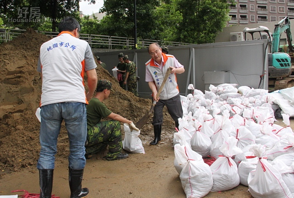 桃園市長蘇家明與國軍弟兄一起裝填沙包,共同為防災整備工作努力。