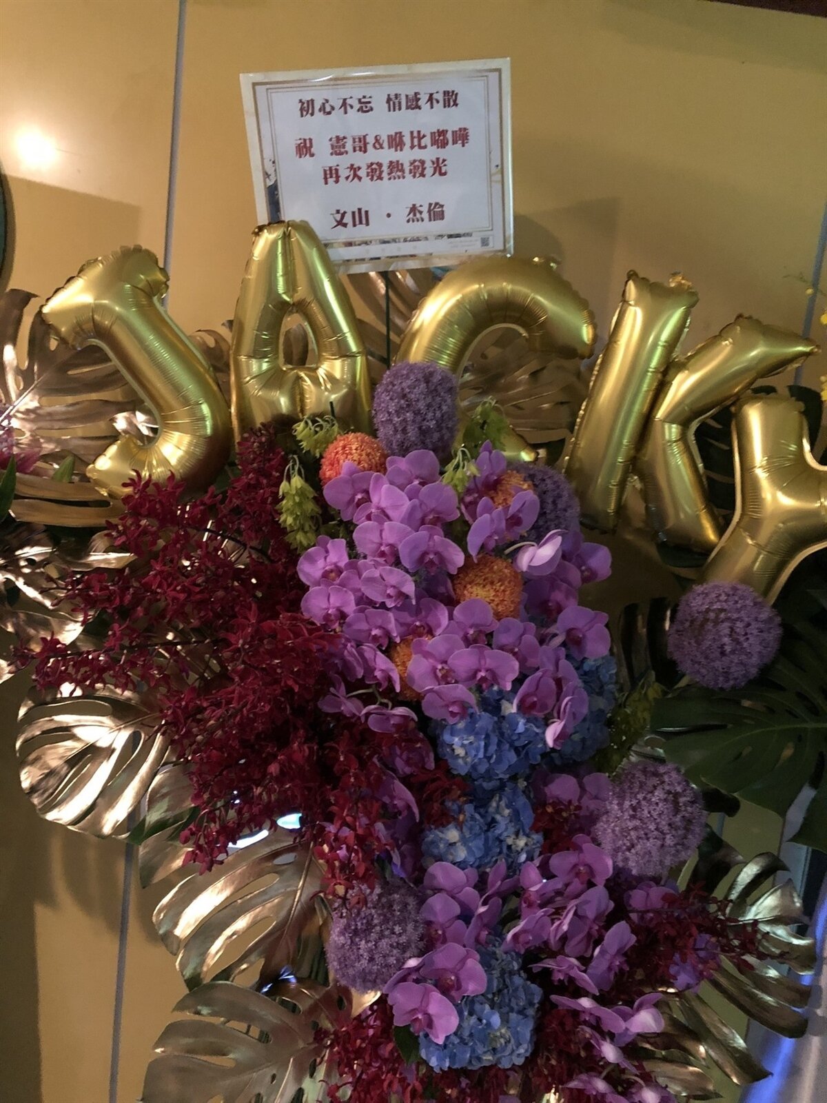 第1場周杰倫無法到場支持,和方文山一起送來花籃,寫道:「初心不忘,情感不散。祝憲哥&咻比嘟嘩再次發熱發光。」吳宗憲在圈內人緣好,謝金燕也送上祝福花籃說:「憲哥幹得好!演唱會大成功。」蔡依林的花籃寫說:「總是用行動展現『保持幽默』的大小孩,演出成功。」