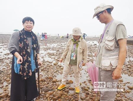 名作家張曉風(左)4日親往新屋海濱,了解當地藻礁生長面貌。(記者楊宗灝/攝影)