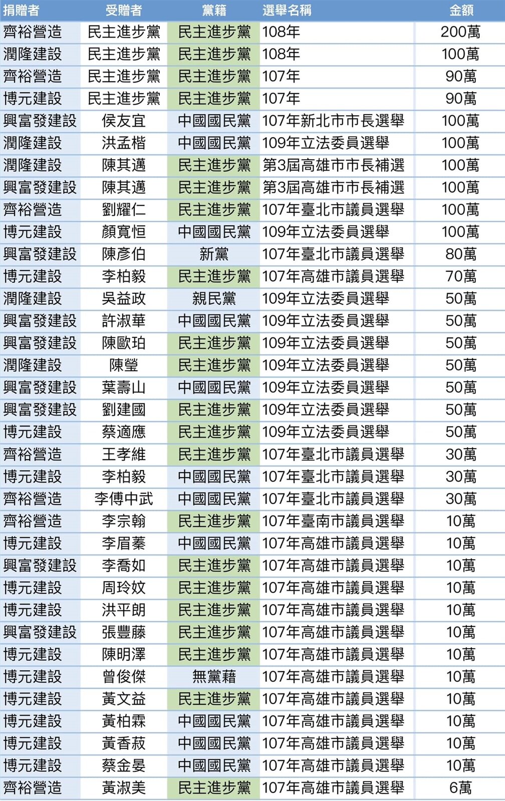 邱顯智昨日砲火猛烈,還引用監察院的資料列舉藍綠政壇人士誰收受營造業者的政治獻金,清單中赫見不少大咖,包括國民黨的侯友宜、顏寬恆以及民進黨的陳其邁等人都在列,文末還註解表示,「房地產不是經濟火車頭,房地產卻是政治火車頭」