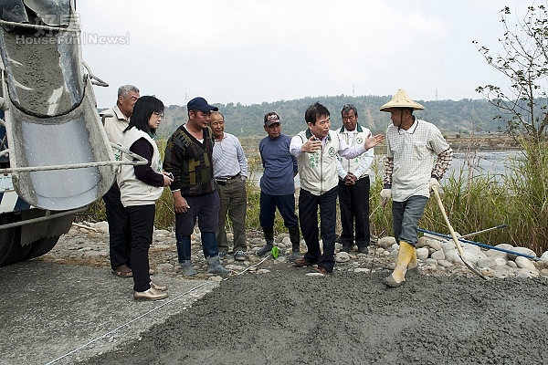 21日上午開始灌漿,吳敏濟到場協調施工,確保符合農民的需求。吳敏濟說,河川地有大片土地種植是事實,每天來往農耕車等繁多,政府照顧農民應做定期整修便道,才能顯出愛民之德政。