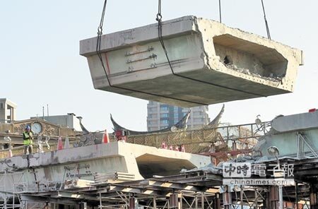 值得注意的是,為避免震動古蹟,與北門距離最近的引道只能先透過鏈鋸切割成5段,再逐一以吊車「夾走」,原預計需6天,但至昨下午4點,第一段長5.8公尺的橋面節塊已吊卸完成,北門的輪廓也隱約露出一部分。