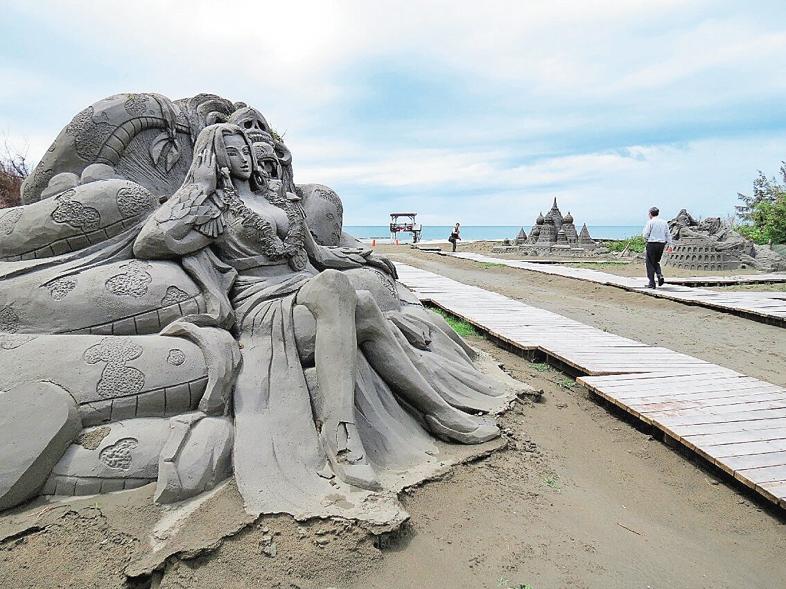 去年「一見雙雕」藝術節在馬沙溝海灘的沙雕創作,放置快一年仍未破損,吸引遊客參觀。(記者周宗禎/攝影)