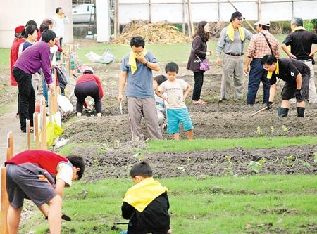 ▲「活化休耕地」新政策明年元旦上路,農委會認為該方案有助於鼓勵年輕人回鄉,增加就業機會。圖為新竹市湳中里休耕農地作為的「湳中里開心農場」,父母帶孩子扛著鋤頭、握著鏟刀,享受務農樂趣。(本報資料照片/陳育賢攝)