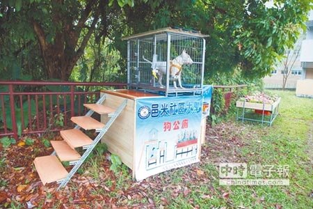 嘉義縣邑米社區大學水耕創意班12日發表全國首創的「魚菜共生狗公廁」,利用架高的籠子與底下養魚的水箱組合成「狗公廁」,毛小孩上廁所就將排泄物作為魚食,分解後還可水耕種花綠美化,此項發明已獲得國家專利認證。
