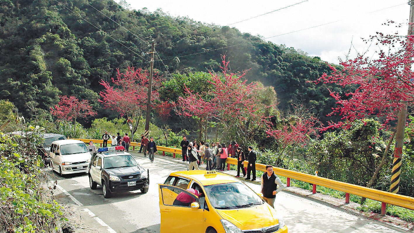 中橫公路153公里處的刷坡工程造成道路短暫封閉,許多民眾也趁機休息,新賞路旁整排山櫻盛開之景。有人拿出相機拍照留念,或者倚著欄杆聊天賞花,也有人直接席地而坐,細數地上朵朵花瓣,彷彿就是一場賞櫻大會。