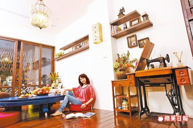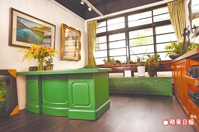 書房的書桌和矮櫃,原本是厚重的深棕色,換成綠色後,令人耳目一新。秀華說:「書桌原是以前開旅行社時的舊辦公桌,矮櫃則是神明桌下方的櫃子,現在都有了新用途。」她還將餐桌桌腳鋸短、漆成藍色,擺在起居室,一旁相伴的是有70、80年歷史的縫紉機,室內處處充滿家的感情。