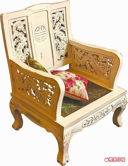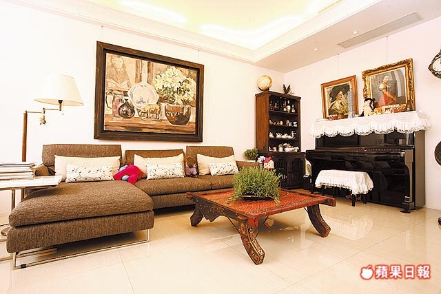 秀華熱情地向我們介紹裝潢設計,心神透著一股堅定。她一直以來是家裡的支柱,房子的陳設混搭婆婆留下來的舊家具,比如擺在舞蹈室的大理石桌椅、起居室的矮桌、書房的書桌及矮櫃,還有角落的縫紉機、老木箱等,都是幾十年的老件。「我原本想把一些老家具丟掉,但設計師建議可以改造或換顏色,加以利用,我覺得有道理,現在看起來效果還不錯。」像大理石桌椅,雕龍刻鳳的,非常台味,原本在淘汰名單中,現在改漆白色,與繽紛畫作撞擊出奇妙的趣味。