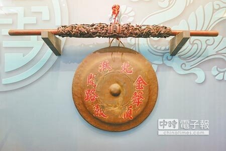 北港鎮北港文化中心最近展出地方陣頭文物,其中金聲順的清代銅鑼歷史最悠久,金聲順古樂協會理事長張崑煌表示,此鑼是協會的鎮會之寶,由清末中國大陸工匠製作,已有百年歷史,外表古樸,配合日治時代的精緻鑼桿,顯示每個時代工藝的不同。