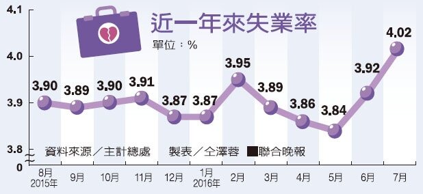 又見4字頭失業率!主計總處今天公布7月失業率4.02%,為近兩年來新高,主要原因是去年下半年起受景氣低緩影響,失業率逐漸墊高,到了今年7月畢業生大量投入求職市場,初次尋職失業者增加所致,主計總處認為扣除季節因素,7月失業率未較6月惡化。