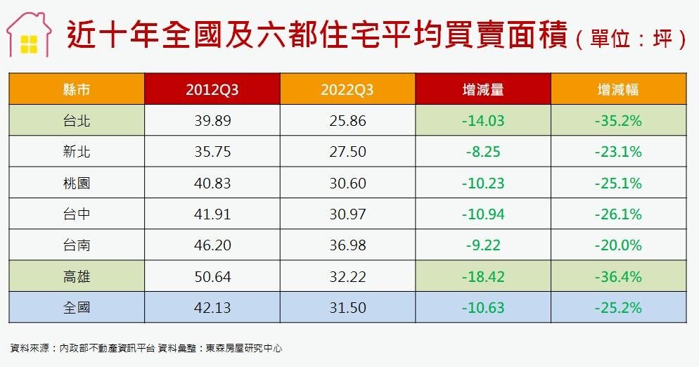 伴隨全台房價持續高漲,普通民眾的居住環境正在接受挑戰,依據內政部不動產資訊平台資料顯示,去年Q3全台的平均買賣面積為31.5坪,相較於2012年同期的42.13坪,十年時間就蒸發了10.63坪,約為一間大套房的面積,縮水幅度竟然達到25.2%。對此,東森房屋研究中心經理葉沛堯認為,房價飆漲、少子化及居住觀念的轉念都有可能是導致買賣面積縮水的原因,而且在目前房價水平仍高的背景下,未來民眾的居住空間恐怕會愈來愈窘迫,如何真正落實居住正義、讓所有民眾安居樂業,還需要政府和全體社會共同思考。