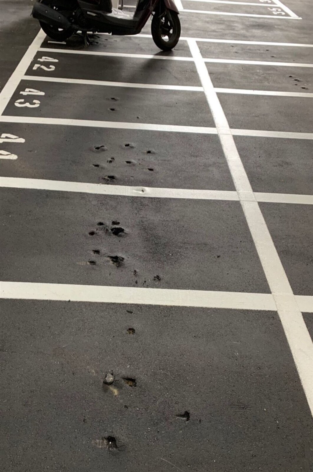中壢區自強多目標立體停車場,機車停車場格位柏油,因機車立柱停放,造成不少坑淀受損。 記者張弘昌/攝影