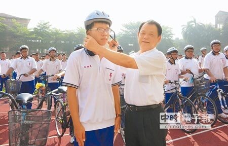 高英工商校長(右)為學生戴上安全帽。(截取自中時電子報)