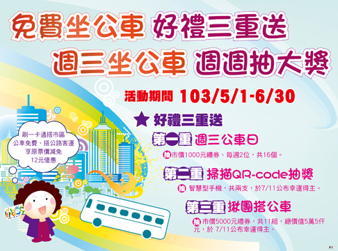 為持續培養民眾搭乘及轉乘公共運輸之習慣,倡導民眾掃描QR-CODE查詢公車動態資訊,並鼓勵民眾呼朋引伴一起揪團坐公車,自5月1日起加碼舉辦抽獎活動,只要登錄資料並刷一卡通搭公車,就有機會抽中高額禮券或智慧型手機。