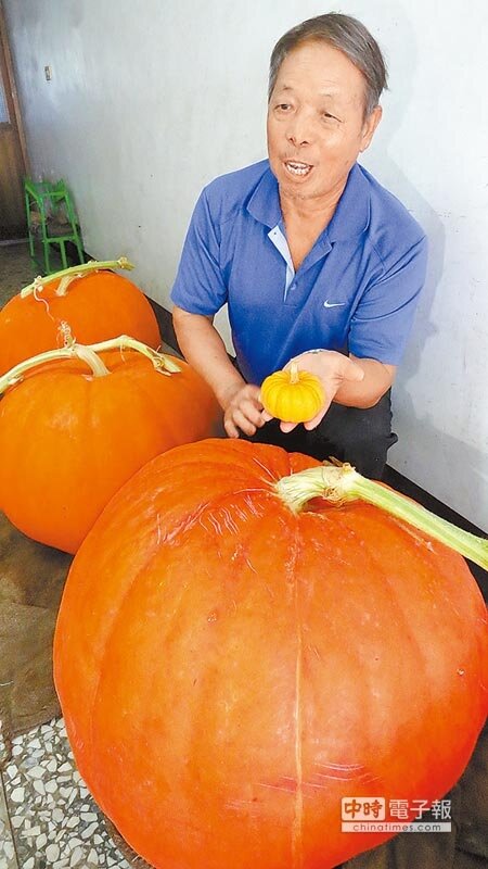 彰化縣溪湖鎮農民黃重順號稱是南瓜達人,栽種的南瓜很吸睛,近日他收成6顆大南瓜,每顆重量都超過100台斤,體型足足是「玩具南瓜」的500倍,讓參觀的小孩與大人都感到很驚訝!他表示,玩具南瓜最輕每顆重量約僅3台兩,只有大南瓜1/500,不論是迷你或巨大都很受市場歡迎。