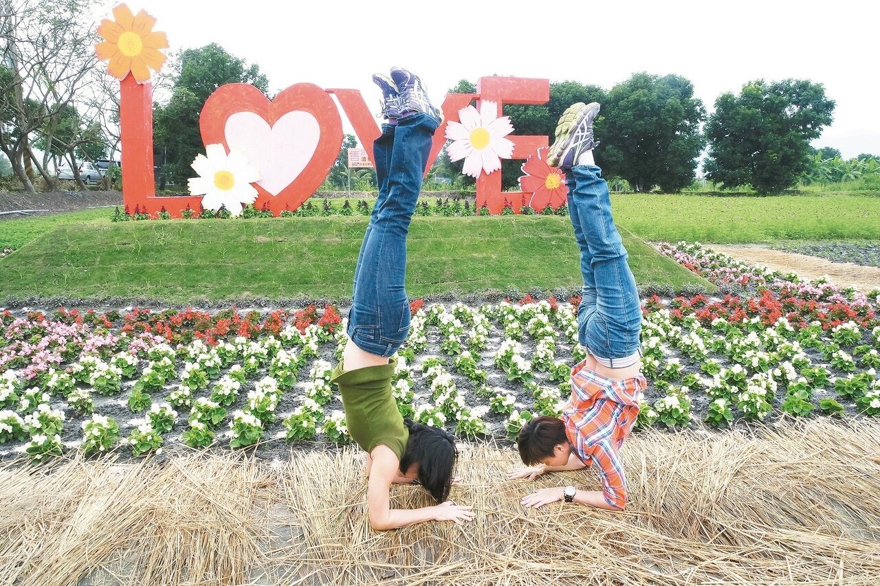 壽豐花海吸引許多民眾觀賞,還有來自馬來西亞的遊客以倒立的方式與花朵合影,引得現場民眾笑開懷。