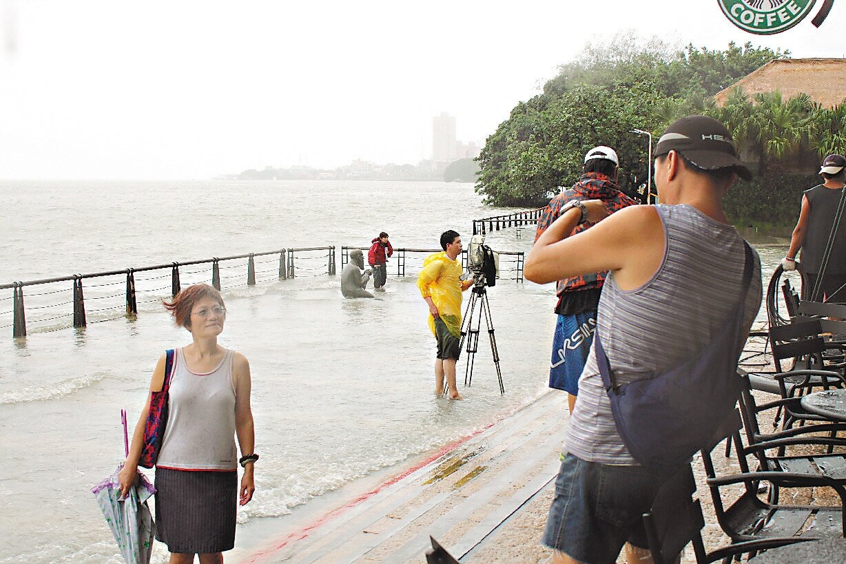 來自四川的羅姓遊客說,淡水河面水勢盛大,潮水一波波湧上岸,覺得「很壯觀」。但淡水區長蔡葉偉說,這種狀況可能是地層下陷造成,希望有關單位早日解決,「別讓馬偕博士再泡水了!」