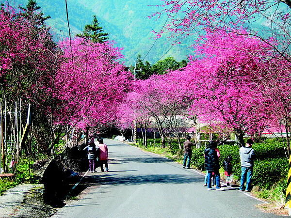 省道台7線宜蘭縣大同鄉路段,上萬株山櫻花沿路綻放,今年連續寒流,櫻花提早綻放,藍天白雲搭配緋紅山櫻花,遊客驚呼:「美呆了!」昨有日本遊客搭上賞櫻潮,高興地說:「比日本的還要紅!」