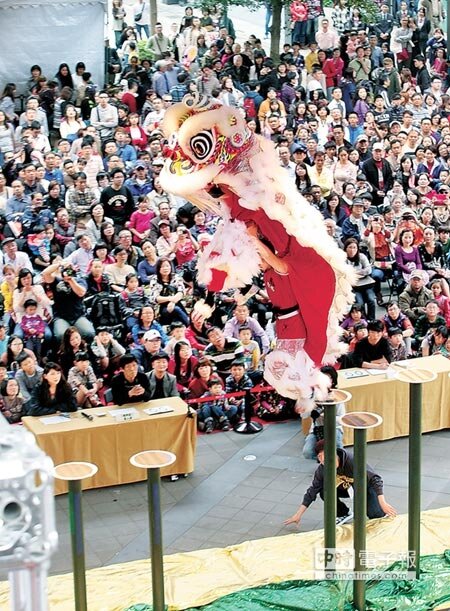 大年初三氣溫回升,民眾把握好天氣外出逛街,欣賞高難度的舞獅演出。(記者王英豪/攝影)