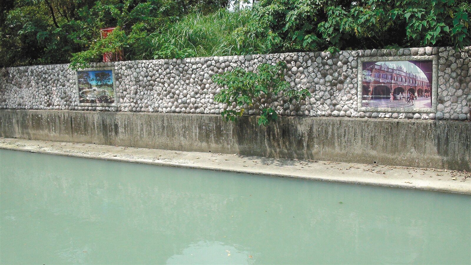 桃園大圳為美化景觀,將陶板裝飾貼在圳道上,形成新的觀光景點。(記者游文寶/攝影)