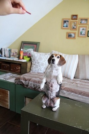 2. 教牠LOOK(看) 的指令:拿著牠喜愛的零食,讓狗狗的視線隨著零食移動到我們的眼睛旁邊,如果牠順利將眼光跟上來,這時候說「OK!」便把食物丟出去給牠獎勵。練習幾天後,當我們手上不拿零食,喊出「LOOK」時狗狗也能自動看我們的眼睛,之後拍照就可以把相機拿到胸前,對牠說LOOK,那麼狗狗雖然看著我們的眼睛,拍出來的角度卻會像是看著鏡頭一樣。