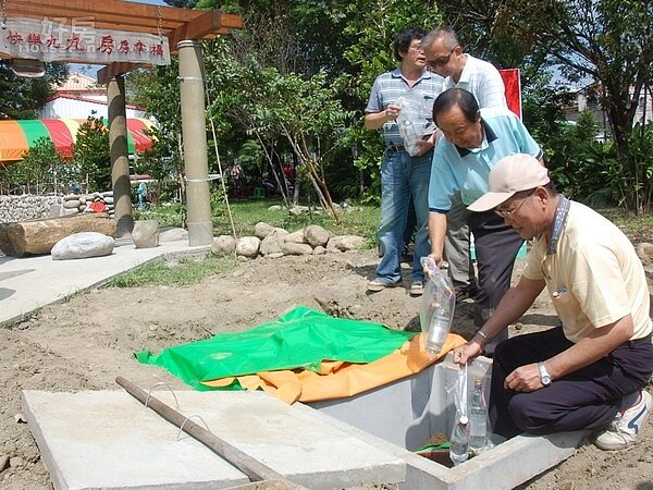 石岡區九房社區「九久亭」落成啟用,辦理「藏酒」活動中,社區居民將酒品放入地下陶缸中。(記者黃玉鼎攝)