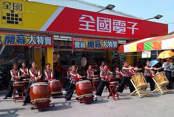 水里國小太鼓表演為全國電子水里門市開幕活動揭開序幕,水里鄉長江龍漢、南投縣議員陳淑惠抵達現場致意,水里鄉民代表會主席林志郎、南光村長賴建中及鄉親們共同見證全國電子水里門市的誕生。