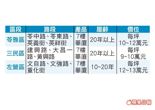 何忠義指出,三民區7樓華廈也不少,如建興路、黃興路及大昌一路等,屋齡20年以上居多,每坪約9~10萬元,左營區也有部分7樓華廈,如崇德路、文自路及文強路等路段,屋齡約10~20年,因周邊機能完整、指名度高,近年房價上漲速度快,每坪約12~13萬元。