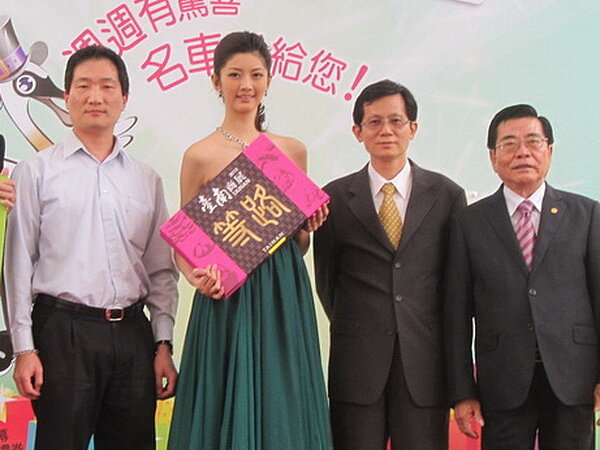 右起台南市商業黃江山理事長、經發局副局長殷世熙、親善大使吳宜樺、嘉年華總經理王國安共同推薦台南購物節台南購物節。〔圖/記者吳順永攝〕